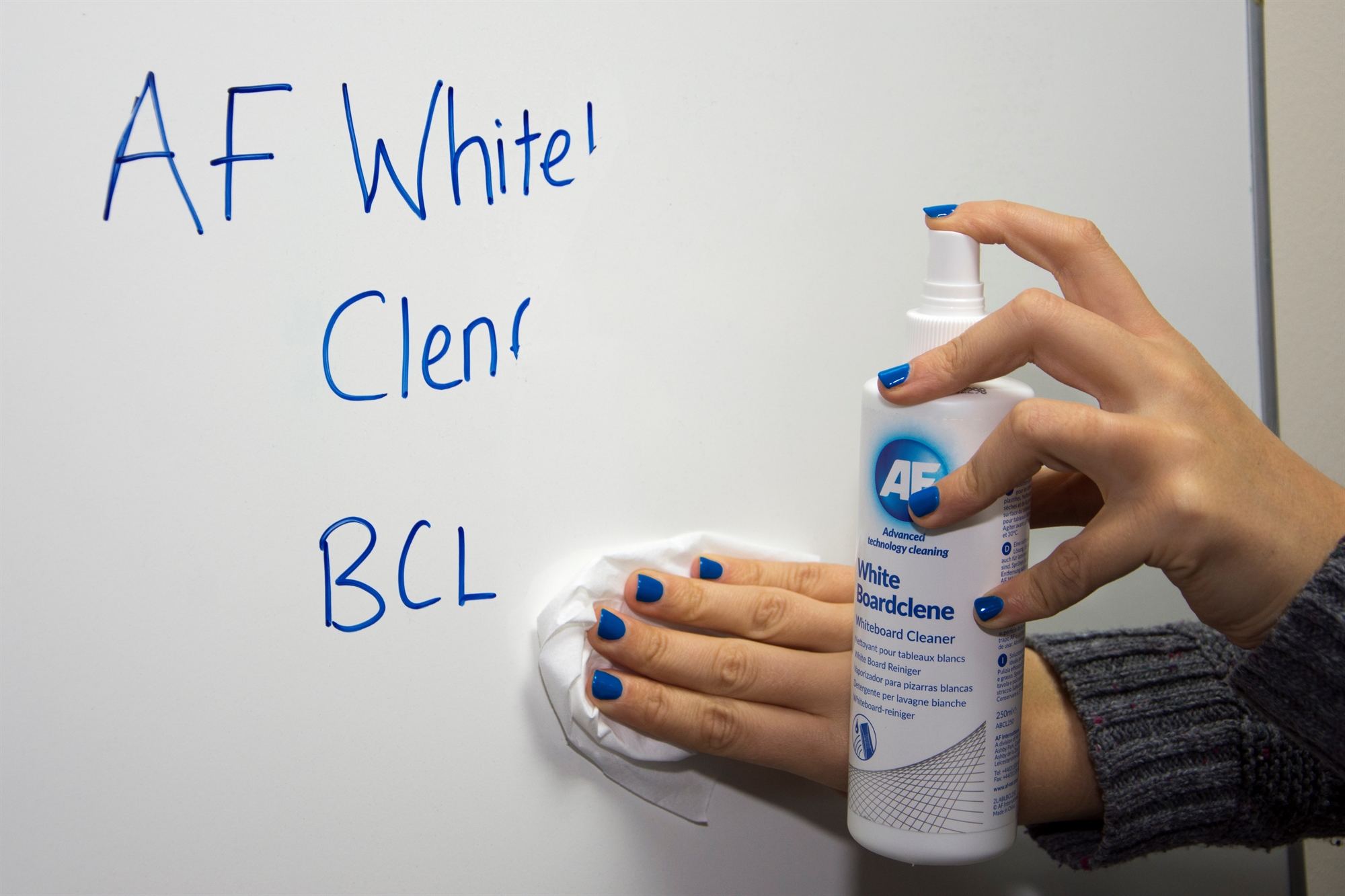 • AF Whiteboard-Clene. Effektivt til daglig/regelmæssig fjernelse af blækrester på laminerede og emaljerede overflader. For at opnå det bedst mulige resultat, anbefales det at produktet bruges sammen med en AF renseklude. Indeholder: 250 ml