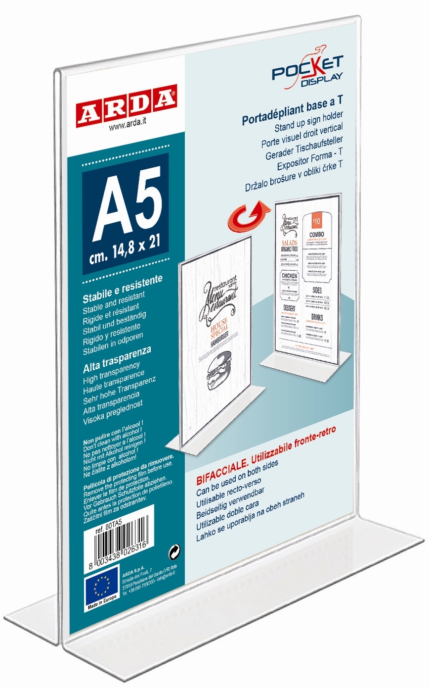 • Skilteholder i A5 størrelse med T-fod. Produceret af glasklar polystyren.