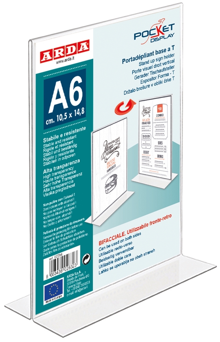 • Skilteholder i A6 størrelse med T-fod. Produceret af glasklar polystyren.