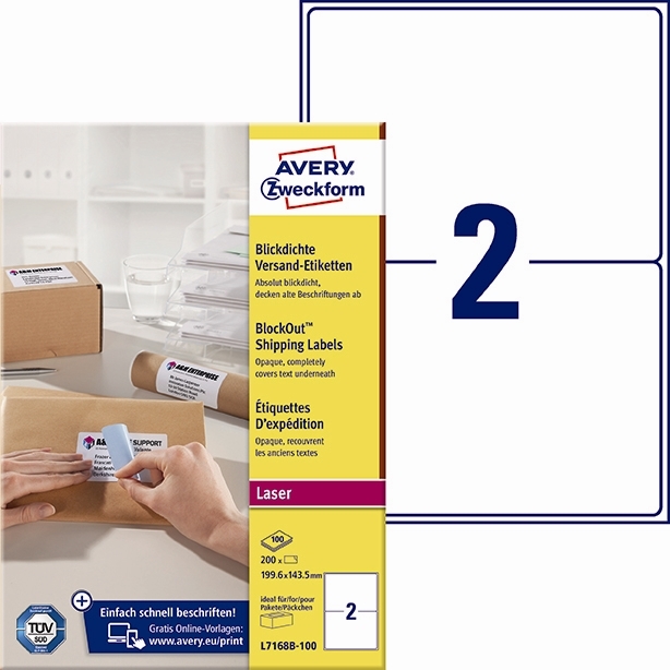 • Giv dine pakker og breve et professionelt udtryk ved at bruge disse helt hvide 100% dækkende pakke-etiketter. Avery's L7168B-100 med BlockOuthar 2 etiketter/ark og 200 etiketter/pk, og er fremstillet i et materiale, der både skjuler gammel tekst og etiketter og holder til hele turen. De er det perfekte og økonomiske valg da de 100% dækker gammel tekst og etiketter så du nemt kan genbruge tidligere anvendt emballage og sende dine pakker med tydelige modtageroplysninger. Det gør etiketterne specielt velegenet som returetiket i din web-shop, når du har behov for at returnere et køb, som du har foretaget på en web-shop eller sende en pakke. Etiketstørrelsen er særlig ideel til pakker, rør og kasser. De er kompatible med alle standard s/h- og farvelaserprintere. Den høje papirkvalitet giver dig flotte og knivskarpe prints. Og Avery's JamFREE garanti sikrer at du ikke behøver bekymre dig om etiketterne sidder fast i printeren og giver printerstop. Etiketterne klæber pålideligt og permanent
