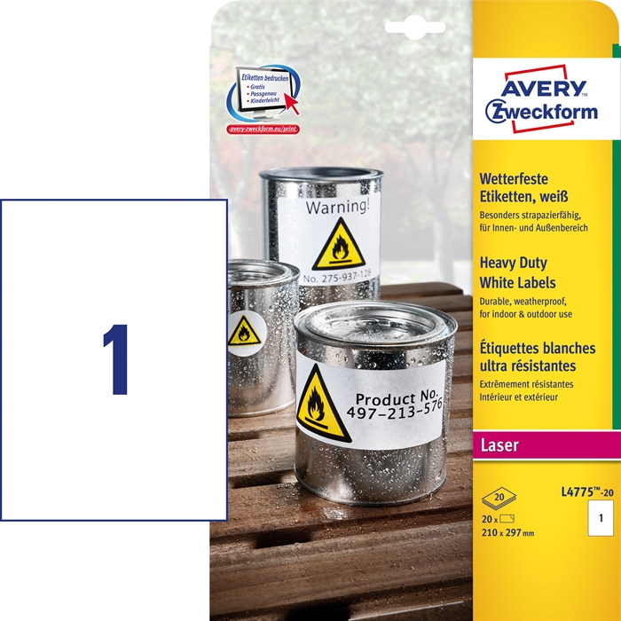 • Ekstra holdbare og permanent klæbende etiketter - perfekte til udendørs brug. Etiketterne er specielt velegnet til brug i omgivelser, som stiller høje krav til holdbarheden, da de er fremstillet af slidstærkt polyester materiale. De er modstandsdygtige overfor olie, smuds, vand og UV-stråler. Tåler temperaturer fra -20 til +80 °C. Etiketterne er velegnet til mærkning af PC udstyr, inventar, værktøj og produkter. Etiketterne er velegnet til laser print. Design og print etiketterne med GRATIS Avery online software, som du finder på www.avery.dk. Etiketformat: 210 x 297 mm. Pakke á 20 ark x 1 etiket/ark = 20 etiketter/pk.
