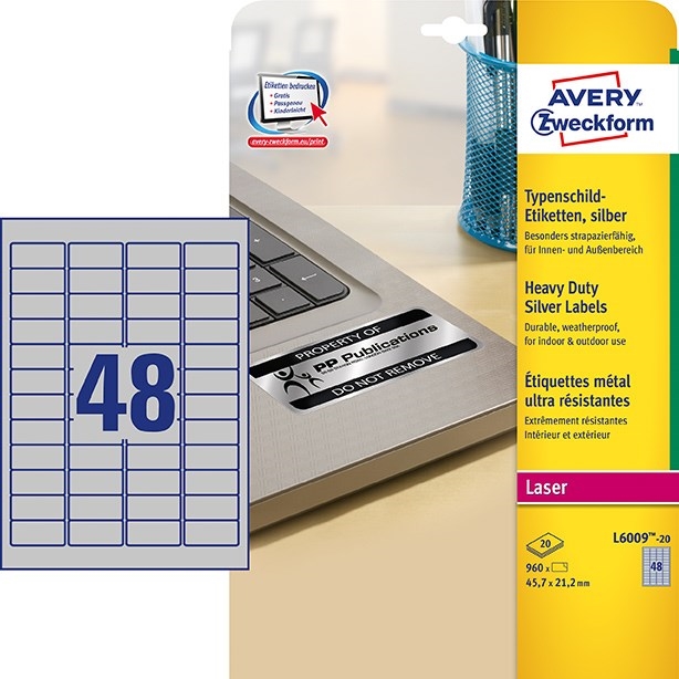 Avery stærke Polyester etiket 47,7 x 21,2 mm sølv mm, 960 stk.