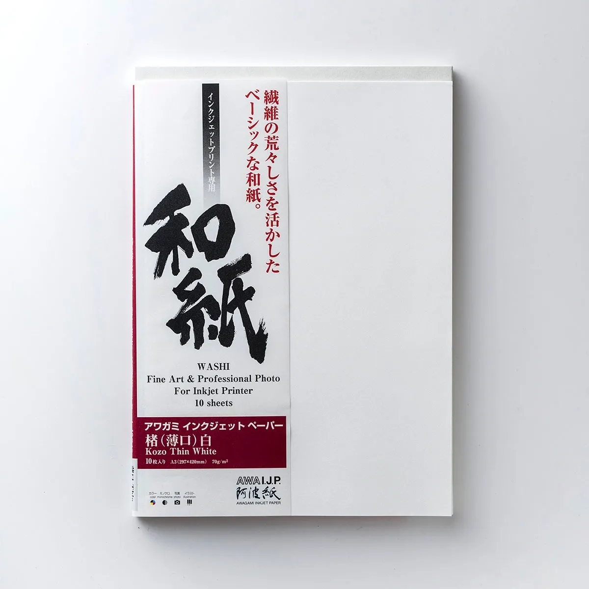 • Awagami Kozo Thin White 70g er et ekstra let, halvgennemsigtigt og bemærkelsesværdigt stærkt washi-papir, fremstillet af 100 % kozo (morbær) fibre – en traditionel japansk fiber med lang holdbarhed og arkivkvalitet. Med sin matte, glatte overflade og rene hvide farve er det perfekt til kunstnere og fotografer, der ønsker et diskret og professionelt udtryk.