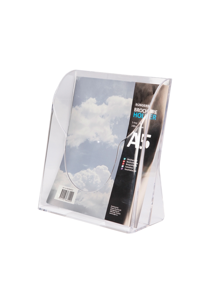 • Brochureholder fremstillet af klar polystyren til pjecer, flyers mm. Mål: H 197mm B:165mm D: 85mm, mål indvendigt B:156mm D: 43mm