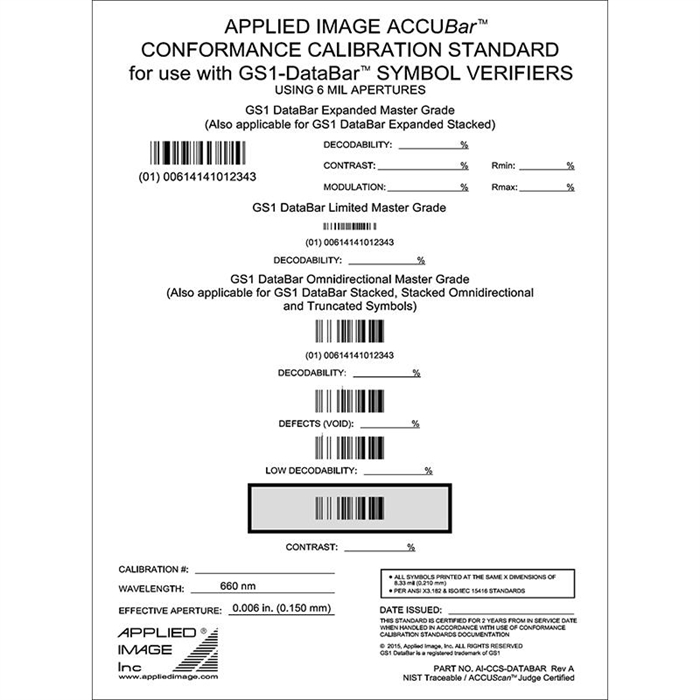• Reference Kortet til GS1 Databar stregkoden både den stacked og den vendbar / omnidirectional kode opbygning. Conformance Calibration standard test card, kortet er udviklet til sikring og dokumentation af din scannerens gradning og værdier er overholdt i henholdt til de af Conformance Calibration standard test card fastlagte værdier. I henhold til ISO 15415 samt ISO /IEC 15426-2 og GS1 standarden.