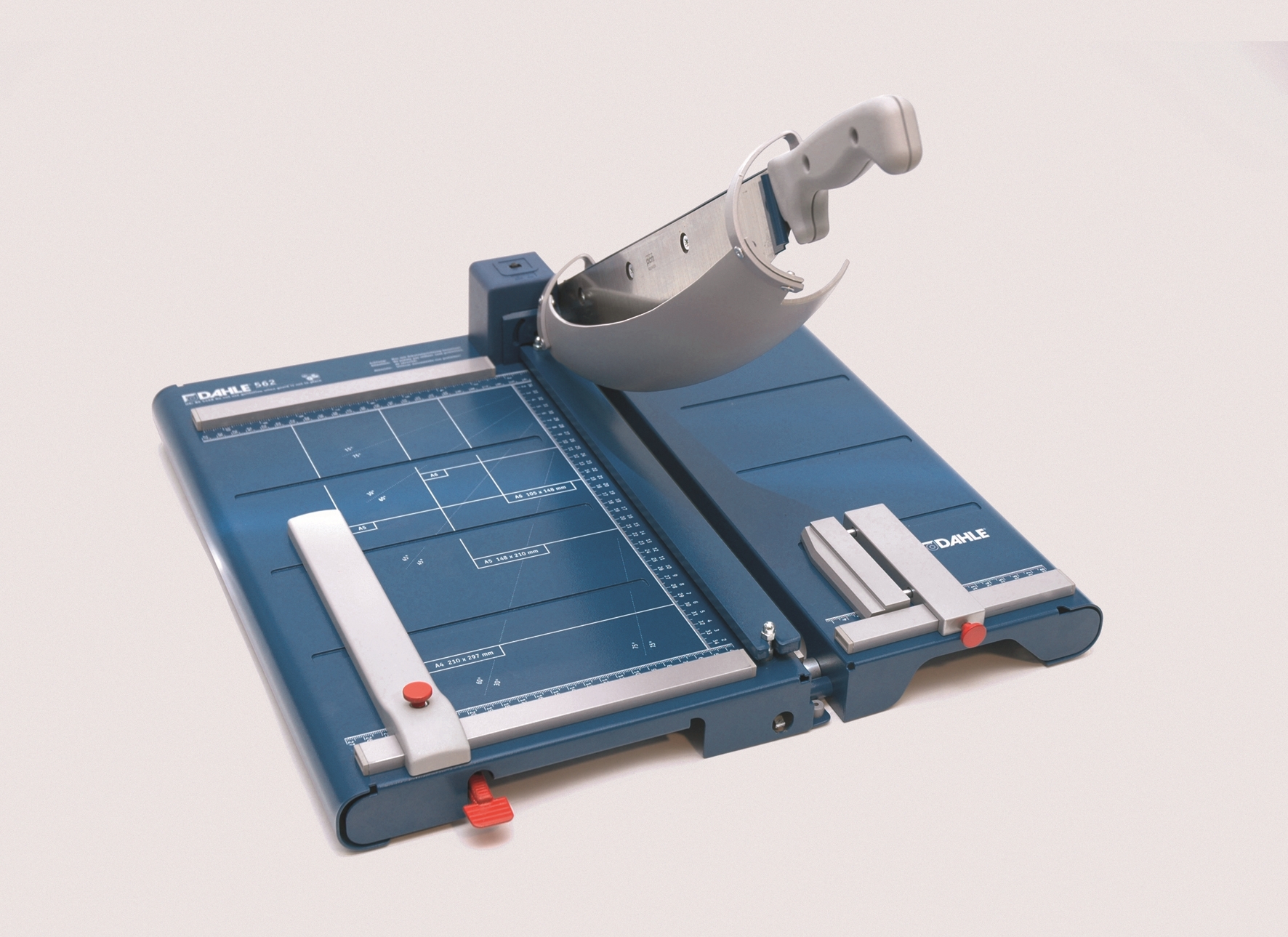 • Dahle 562 er en yderst brugervenlig guillotin med et robust metalbord og skridsikre gummifødder, som egner sig perfekt til professionelt brug. Denne høj kvalitets skæremaskine kommer med et ergonomisk formet håndtag af en klinge som er mulig at slibe på sigt.