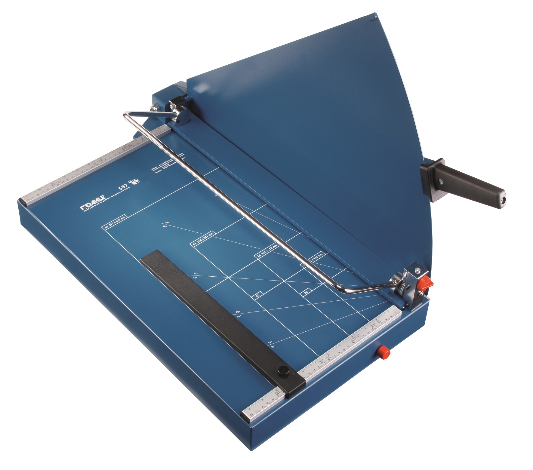 • Dahle 587 er en yderst brugervenlig guillotin med et robust metalbord og skridsikre gummifødder, som egner sig perfekt til professionelt brug. Denne høj kvalitets skæremakskine kommer med et ergonomisk formet håndtag. Justerbar, skruefæstet bagstop i metal til hurtigt at finde det rigtige format - kan bruges på begge skalastænger og Højkvalitets, genskærpes knive lavet af Solingen stål for langvarig skærekvalitet. Dette produkt medfølger en metalafskærmningsplade for forøget sikkerhed.