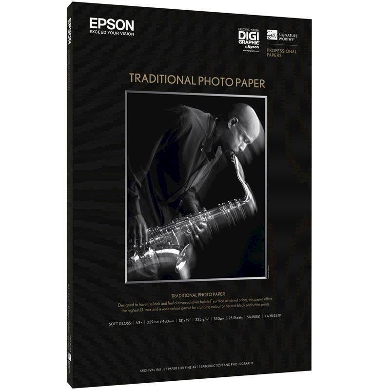 • Epson Traditional Photo Paper er et 0,33 mm tykt syrefrit fotopapir.