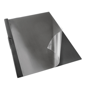 • Universalmappe A4, sort Robust præsentationsmappe med metalklemme i ryggen og transparent forside.. Fastholder papirene effektivt.Kapacitet: 25 arkPP-folie