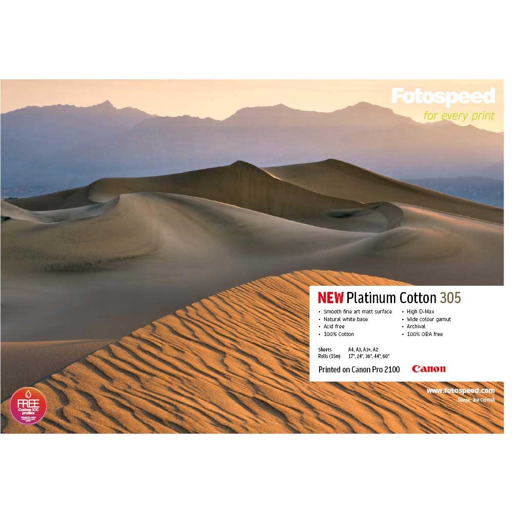 • Fotospeed Platinum Cotton 305 er et 100% bomulds-, syre- og OBA-frit Fine Art-papir med en glat naturlig hvid overflade.