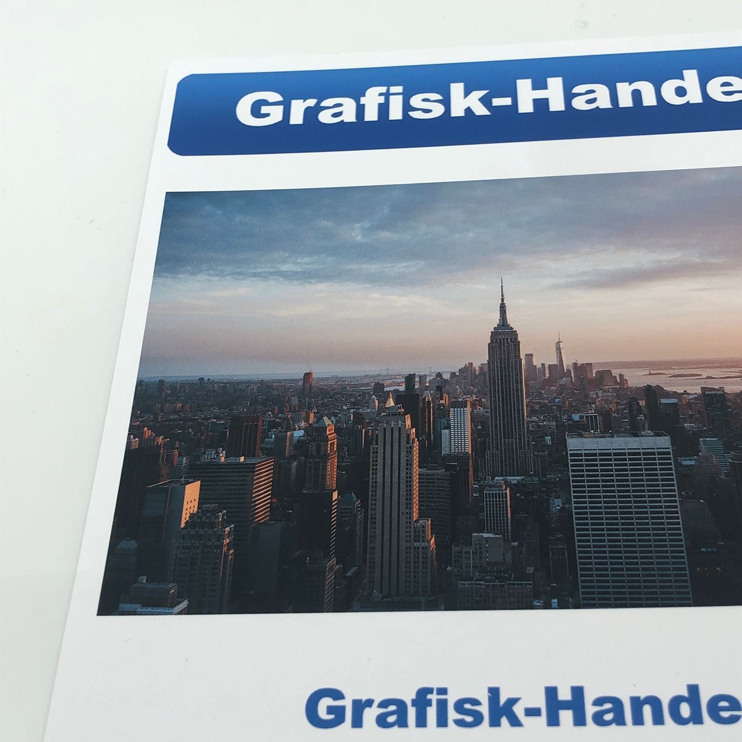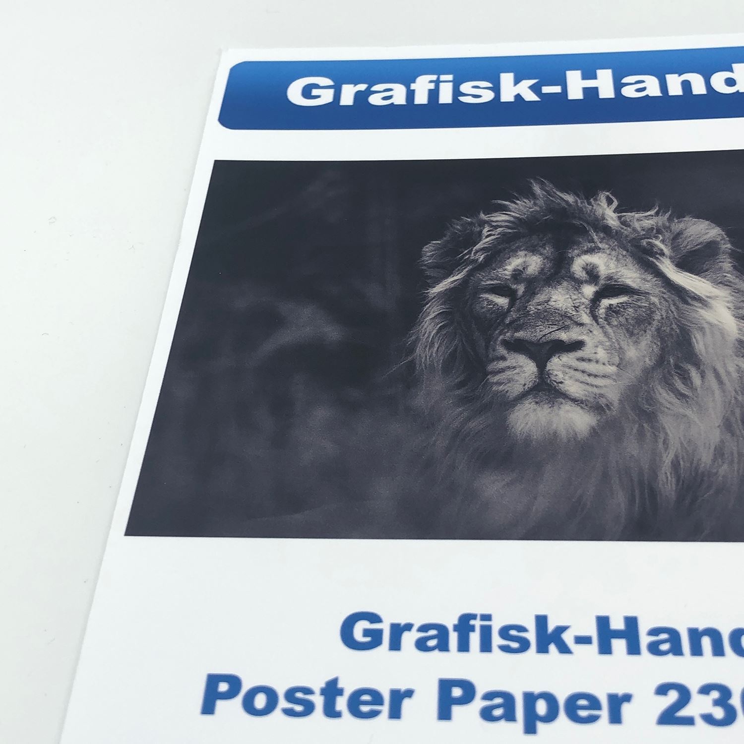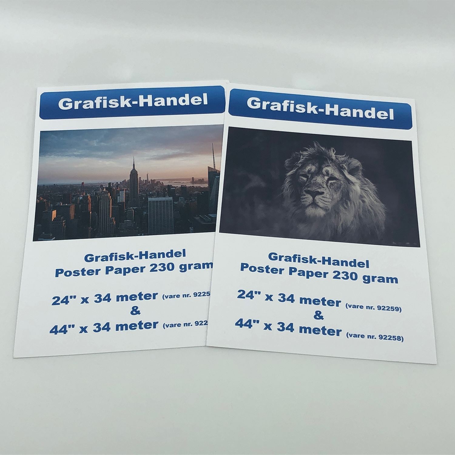 Grafisk-handel poster paper er et 230 grams mat papir uden strutkur og med en pæn hvidhed.