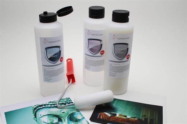 Hahnemühles lak fås i 3 forskellige glanstyper: matte, satin og glossy