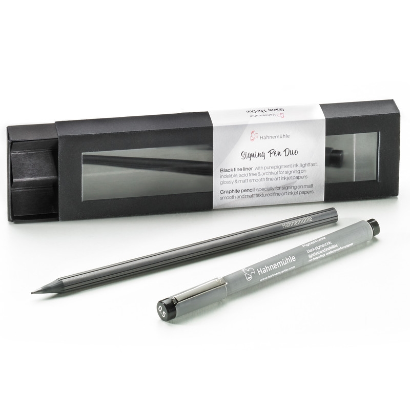 • Hahnemühle‘s Signing Pen Duo helps artists to give their art an even more personal touch, to emphasize edition prints and to complete unique pieces. The classic black fineliner made of pure pigment ink can be used to sign on high-gloss paper surfaces without the signature bleeding through. The pigment liner is indelible, archival, waterproof, odourless, and lightfast. With its fine metal tip, even the most detailed signatures are possible.