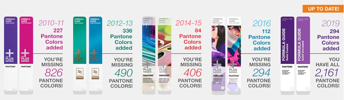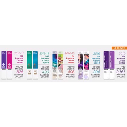 Som det ses på billedet, mangler du 294 farver hvis du er i besiddelse af en Pantonevifte fra før 2016, og du mangler endnu flere farver hvis du har en endnu ældre vifte.