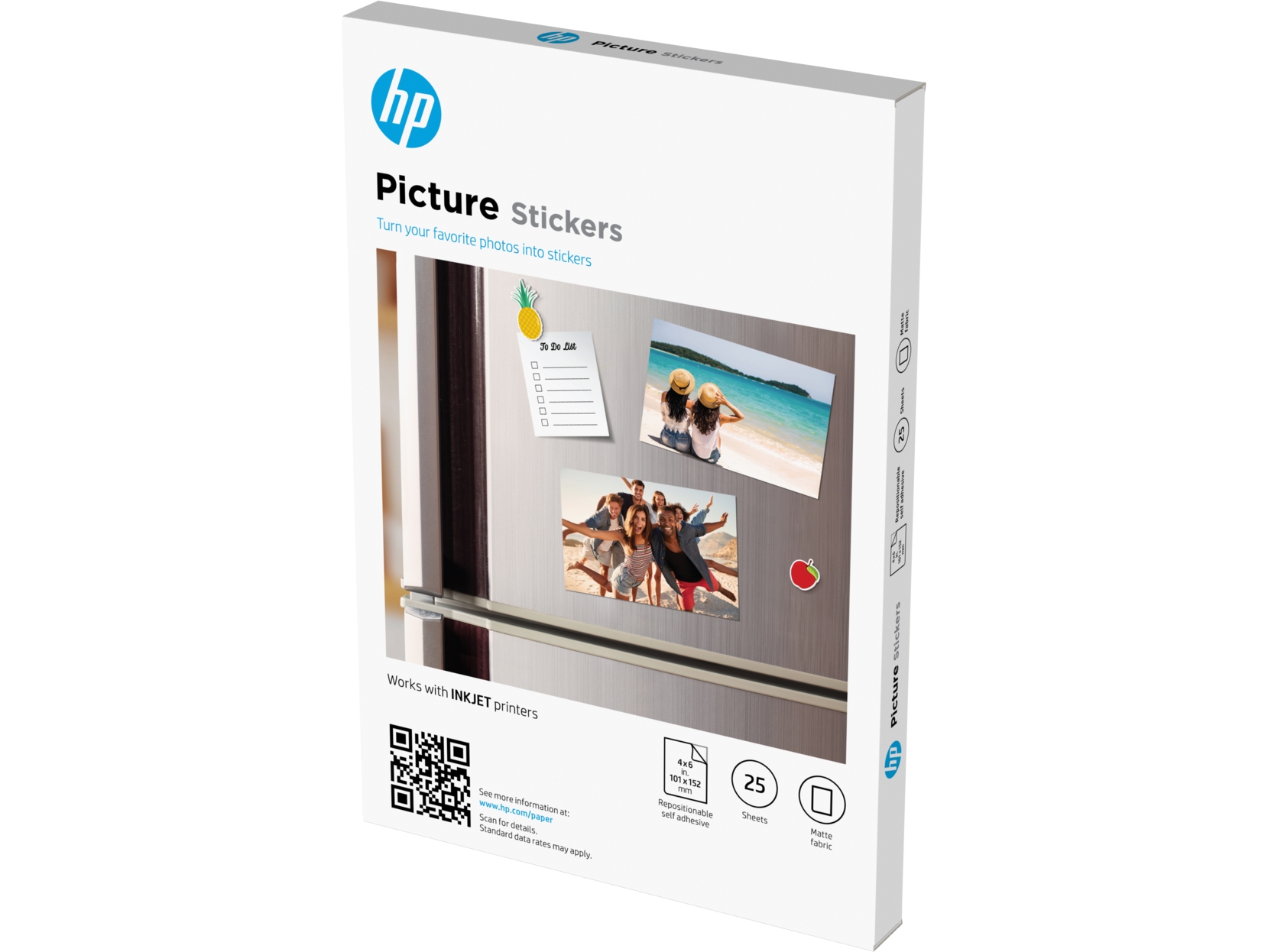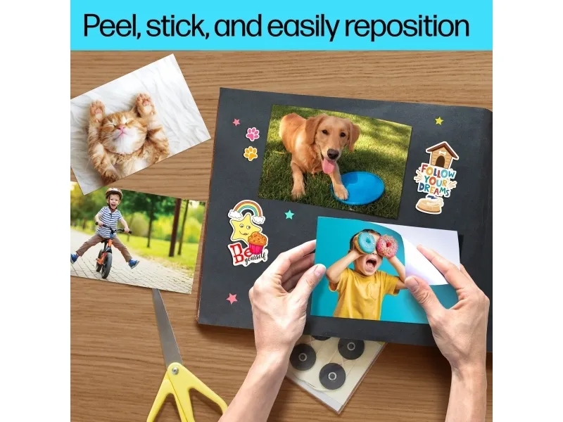 • Gør dine billeder endnu mere personlige! Med HP Picture Stickers kan du printe dine yndlingsfotos som klistermærker og dele dem med venner og familie. Den matte stoffinish giver dine billeder et elegant og eksklusivt udtryk. Klistermærkerne kan nemt flyttes og genplaceres – igen og igen. De tørrer hurtigt, udtværes ikke og er både rivefaste og holdbare.