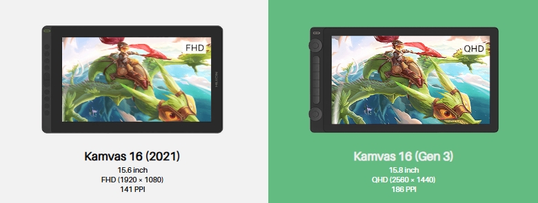 Kamvas 16 (Gen 3) upgrades the resolution to 2.5K QHD (2560x1440), a significant improvement over its predecessor. With its 15.8-inch screen, Kamvas 16 (Gen 3) achieves a pixel density of 186 PPl, providing a sharp and crystal-clear view for artists.