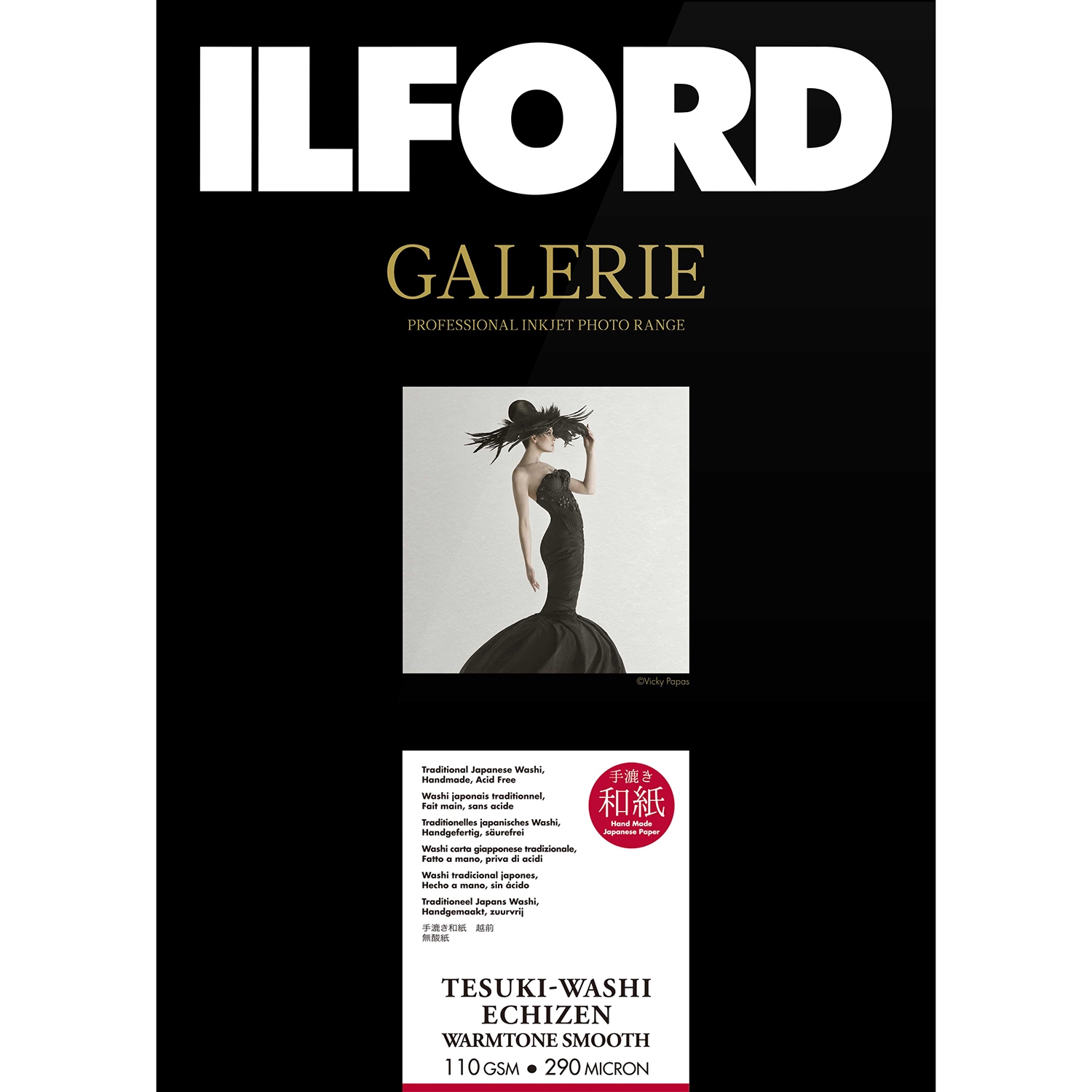 • ILFORD GALERIE Tesuki-Washi EchiZen Warmtone Smooth 110 er ægte håndlavet japansk Washi baseret kunstpapir. Echizen-området, der producerer basispapir, har en washi historie i 1500 år. Washi er omhyggeligt produceret håndlavet og en efter en er det værdsat af mange kunstnere for sin kvalitet og brug for deres kunstværk. Tesuki-Washi EchiZen Warmtone Smooth 110 har en glat mat overflade og kan udføre dyb sort og varm hvid inkjet udskrivning med en naturlig håndlavet tekstur, ved ILFORD's oprindelige belægning.