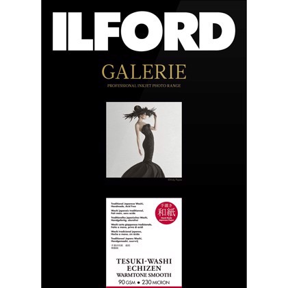• ILFORD GALERIE Tesuki-Washi EchiZen Warmtone Smooth 90 er ægte håndlavet japansk Washi baseret kunstpapir. Echizen-området, der producerer basispapir, har en washi historie i 1500 år. Washi er omhyggeligt produceret håndlavet og en efter en er det værdsat af mange kunstnere for sin kvalitet og brug for deres kunstværk. Tesuki-Washi EchiZen Warmtone Smooth 90 har en glat mat overflade og kan udføre dyb sort og varm hvid inkjet udskrivning med en naturlig håndlavet tekstur, ved ILFORD's oprindelige belægning.
