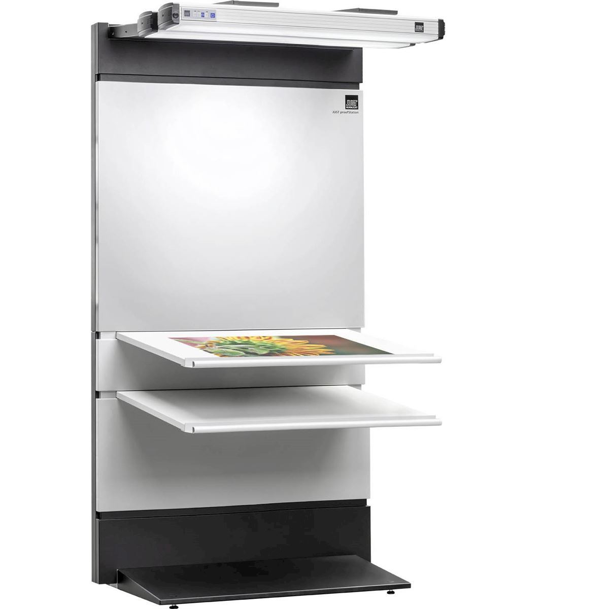• Perfect lighting technology and functional design. No operating hours meter and no expensive replacement lamps. Now you can match colours withour worrying for years. The continuously high light quality of the LEDs far exceeds the minimum requirements according to ISO 3664:2009. The mix of multiple coloured LEDs generates an even more harmonious and complete light spectrum than that of conventional fluorescent lamps. Dimmable proofStations with a practical pull-out keyboard and monitor rail are available for soft proofing applications.