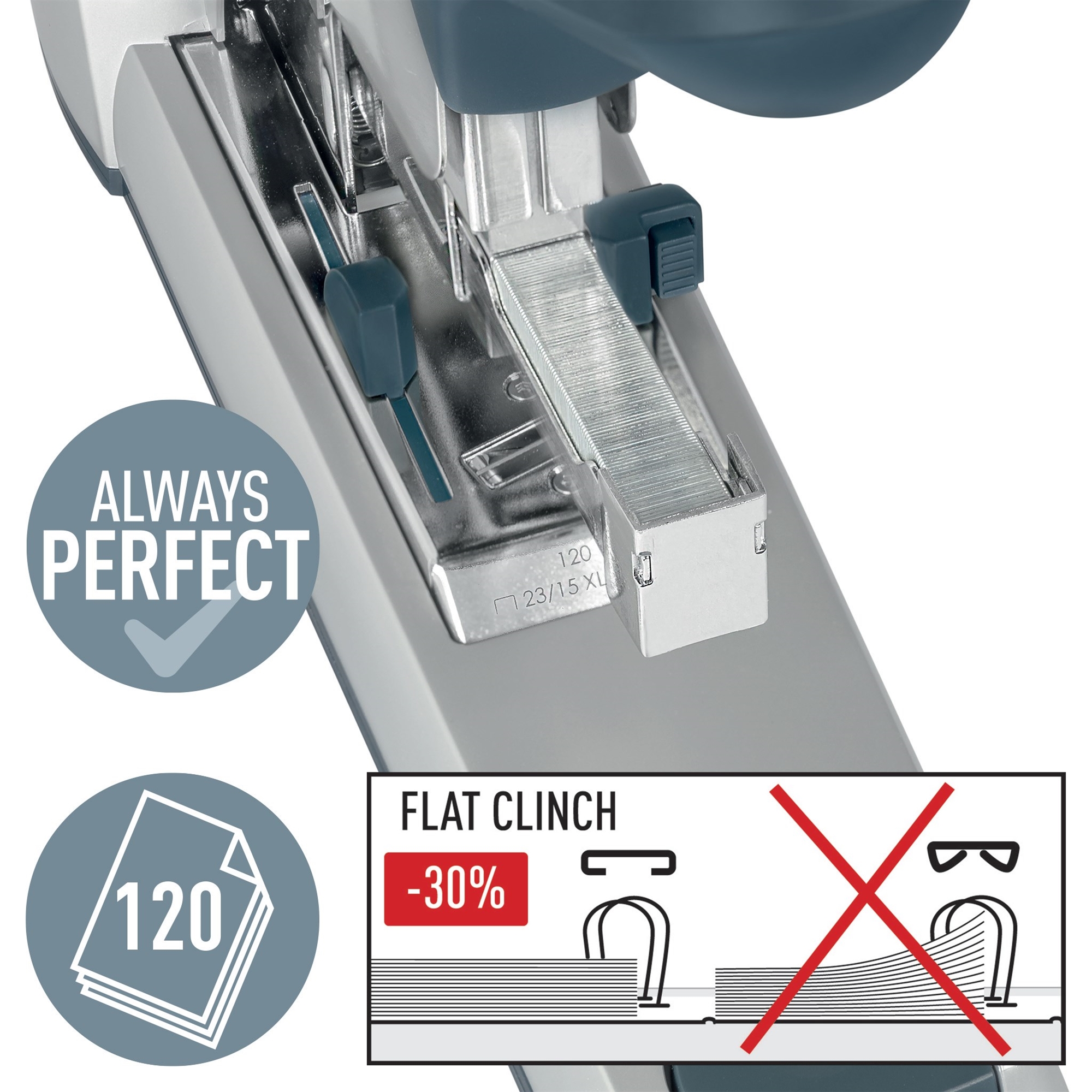 • Hæftemaskine Leitz 5553 Heavy Duty, 120 ark Flat Clinch Heavy duty Flat Clinch hæftemaskine til professionelle hæfteopgaver. Med bekvem refill indikator. Perfekt til postrummet eller kontoret. Hæfter op til 120 ark papirer (80 g) Flat Clinch teknologi bruges ved kompakt arkivering Integreret farvekodet indikator viser, når det er tid til at skifte hæfteklammer Nem frontladning af hæfteklammer Brug 23/15XL hæfteklammer. Hæfteklammepakke inkluderet (1000 stk. x 23/15XL) 10 års garanti ved brug af Leitz hæfteklammer