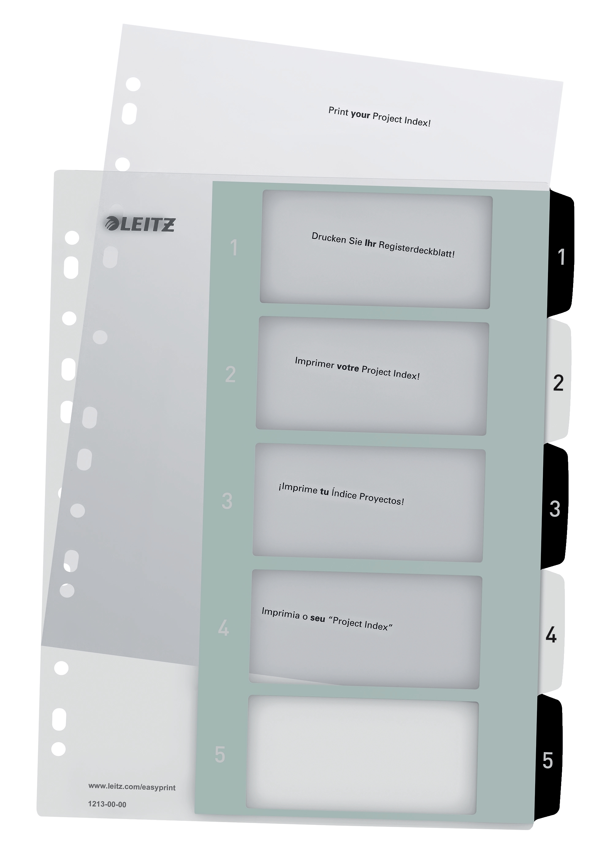 • Register, der kan genbruges, med ekstra holdbare faneblade i en flot sort-hvid kombination. Kan individualiseres med skabelondesign på www.leitz.com/easyprint. - Print smart med eksklusive skabelondesign på www.leitz.com/easyprint - Stærk og holdbar med kraftig 0.30 mm PP - A4 Maxi format giver hurtig adgang, selv når registret bruges med lommer - 5 faner printet 1-5 giver nem sortering - 11-huller universal tilpasning