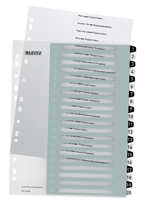 • Register, der kan genbruges, med ekstra holdbare faneblade i en flot sort-hvid kombination. Kan individualiseres med skabelondesign på www.leitz.com/easyprint. - Print smart med eksklusive skabelondesign på www.leitz.com/easyprint - Stærk og holdbar med kraftig 0.30 mm PP - A4 Maxi format giver hurtig adgang, selv når registret bruges med lommer - 20 faner printet 1-20 giver nem sortering - 11-huller universal tilpasning