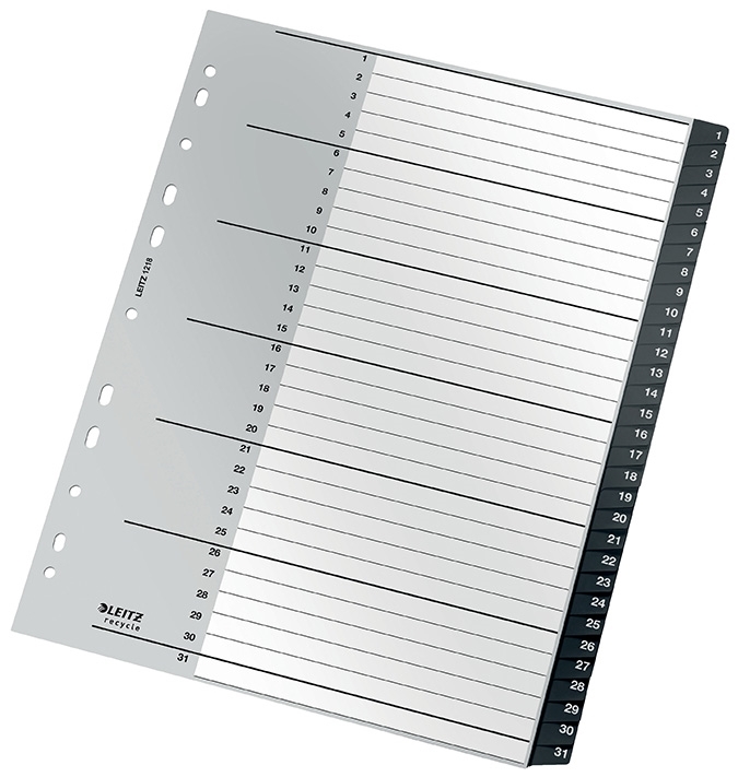 • Ekstra bredt A4-register i premium kvalitet, 1-31 numeriske faneblade. 90% genanvendt plast, klimaneutral og 100% genanvendelig. For tydelig organisering af A4-dokumenter, hjælper med at holde styr på vigtige noter eller skolearbejde; til brug i hjemmet, på skolen eller på kontoret. Dette robuste register supplerer perfekt andre produkter fra Leitz Recycle-serien og er lavet til at holde. Moderne og stilfulde grønne kontorartikler, som vil passe ind på kontoret og i hjemmet. Med den nye miljøvenlige Recycle serie fra Leitz kan du både gøre noget godt for dit kontormiljø - og miljøet på vores planet. - Fremstillet af 90% genanvendt plast, 100% genanvendelig og klimaneutral - For klar organisering af A4-dokumenter - 31 faner trykt 1-31 for hurtig dokumentadgang - Dækker ikke faner, når de bruges med lommer takket være ekstra bredt A4 maxi-format - Holdbar 160 g 100% genanvendt kartonoverflade med stor plads til beskrivelse af indhold - 11 huller universal tilpasning for nem arkive