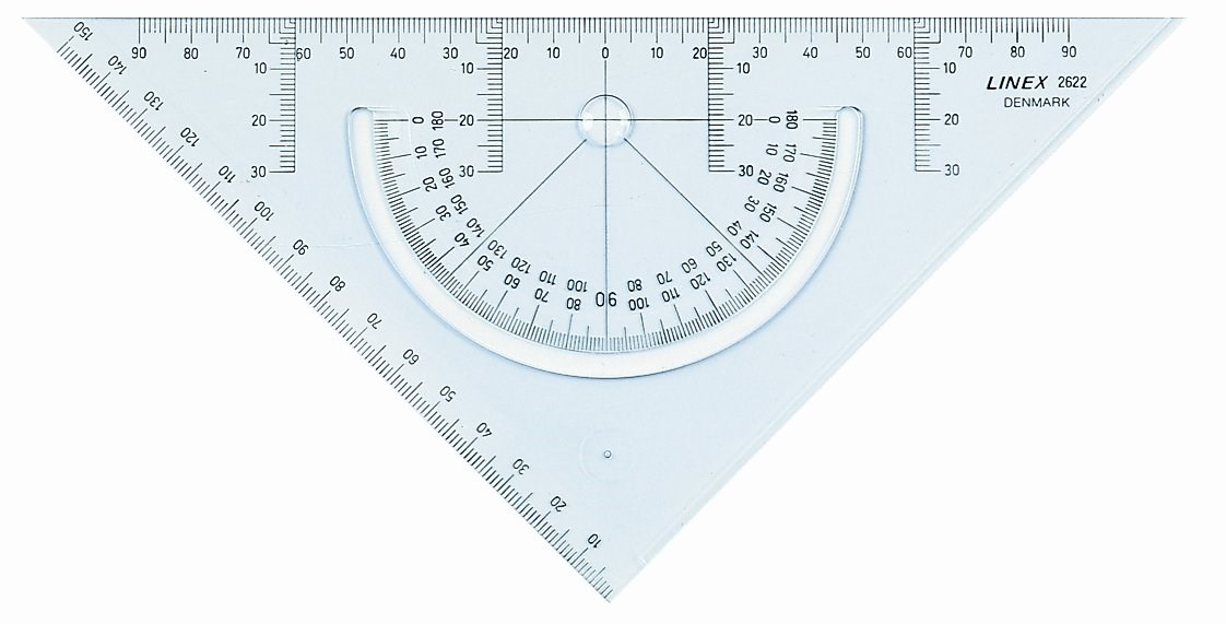 • Geometritrekant med tuschkant, facet og lodret kant. Vinkelmåler med lup over nulpunktet, tværmålsinddeling. 0-punktet midt på hypotenusen. Særlig velegnet ved undervisning i geometri og tegning. Kan anvendes til skravering, gradmåling, oprejsning af den vinkelrette og tegning af geometriske figurer. Materiale: glasklar SAN.