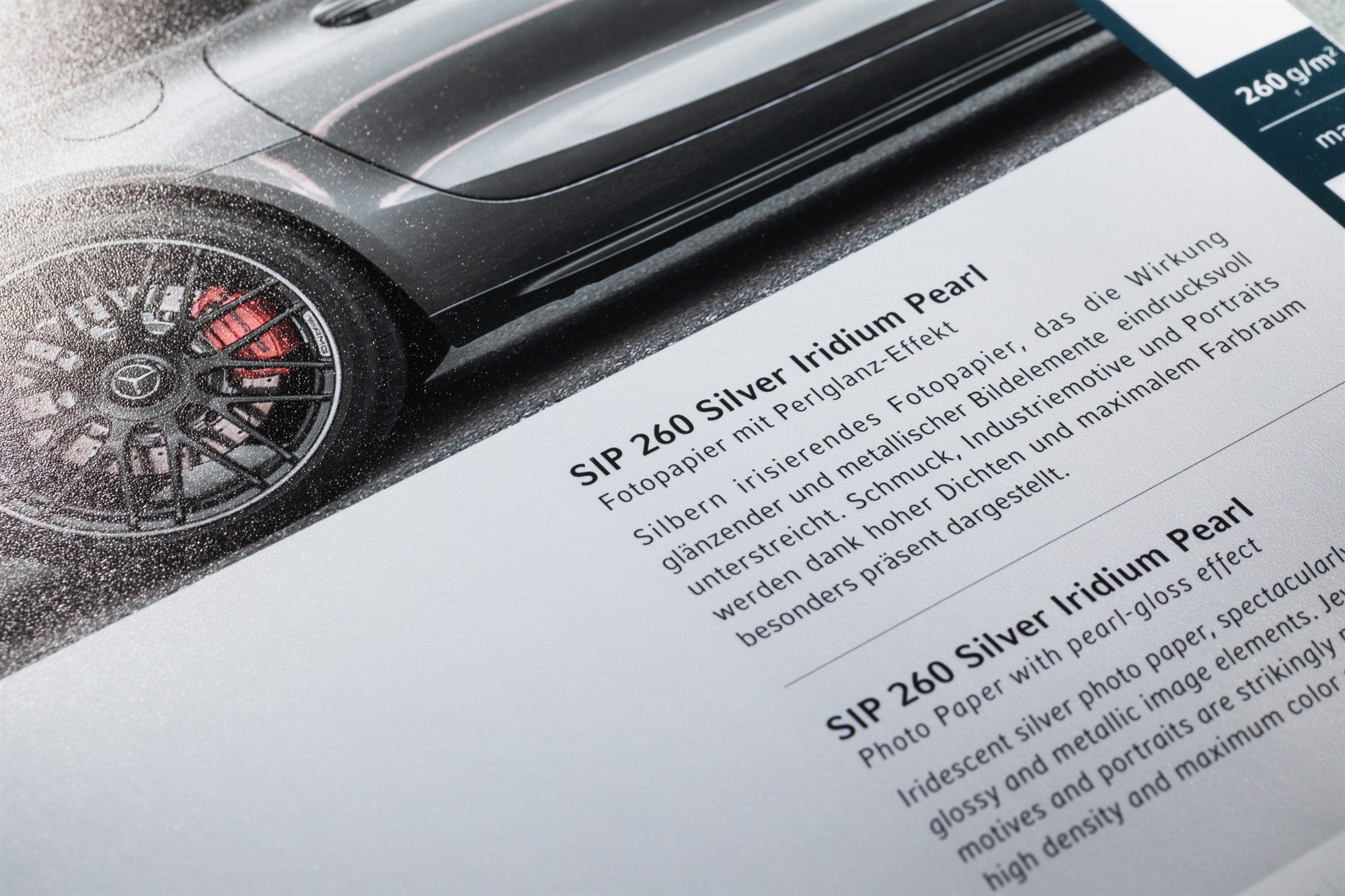 • SIP 260 Silver Iridium Pearl er et nyudviklet fotopapir til digital fotoprint med en speciel iriserende lyster-belagte overflade. Papiret med sin metalliserende perleoverflade er velegnet til både fotos, hvor metalcharakteren skal fremhæves, samt til sort-hvid portrætfotografier, hvor specielle iriserende effekter skal opnås. Med den taktile fornemmelse af et klassisk fotopapir og en høj printkvalitet op til 5760 dpi gengives billeder på næsten fotorealistisk vis, farvenøjagtigt, livligt og detaljeret. SIP 260 Silver Iridium Pearl er et højkvalitets fotopapir, der kan anvendes universelt på alle almindelige LFP inkjetprintere med både farvestof- og pigmentblæk. Den nanoporøse belægning på dette fotopapir giver en fremragende farvegengivelse med stor detaljegrad, skarpe konturer, et ekstremt stort farvespektrum og fremragende planhed.