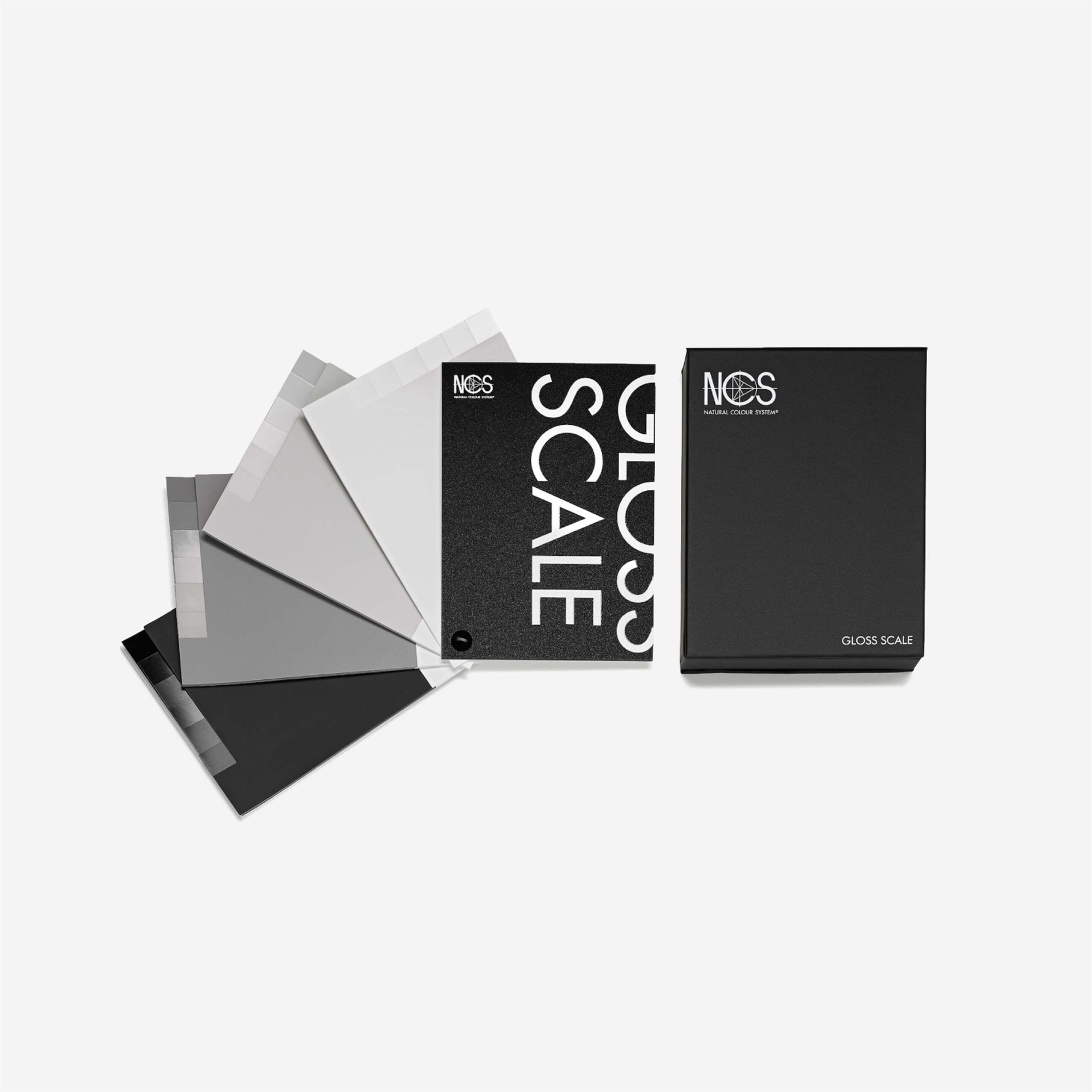 NCS Gloss Scale is a collection of glossy samples with white, light grey, mid-grey and black colour samples that show how gloss appears at different lightness values. A useful tool when the gloss level is to be defined and specified for different surfaces and materials. The collection contains seven even gloss levels (from full matt to full gloss) for every colour on the greyscale. The tool makes it possible to compare, analyse and define gloss on any surface.