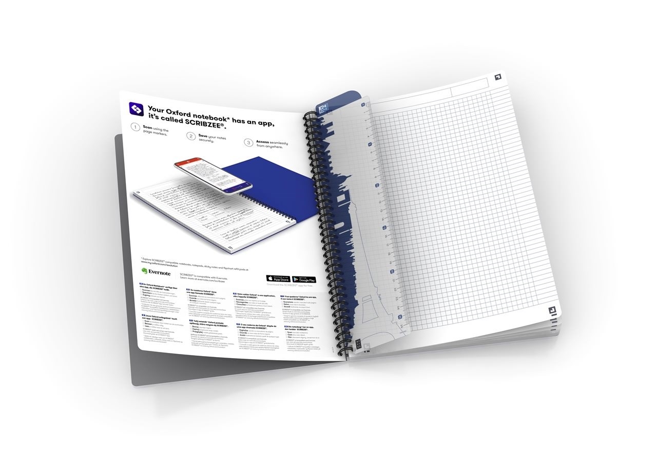 • OXFORD Notebook i A4, kvadreret 5x5 mm med margin, 180 sider. Takket være det ekstra hvide og glatte OPTIK PAPER i 90 g/m2 kan du skrive på begge sider af arket, uden at blækket bløder igennem. Arkene er kompatible med den gratis Scribzee-smartphoneapp, så du nemt kan scanne, gemme og organisere dine noter.