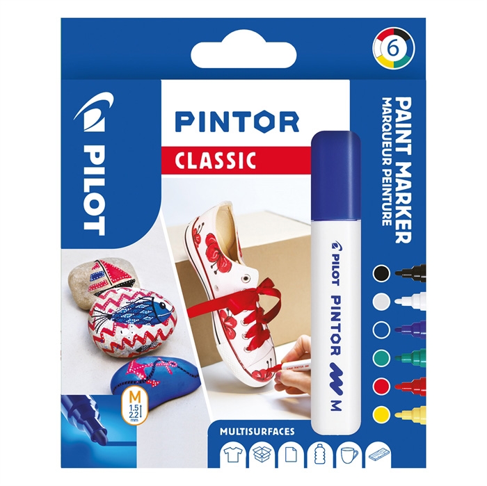 • Pilot Pintor er den ultimative DIY-pen. Vil du give dit tøj et nyt look, personliggøre et objekt eller dine møbler, eller dekorere porcelæn? Pilot Pintor gør alle dine ideer mulige – på alle materialer. Perfekt til tegning, farvelægning, dekoration, mærkning, skrivning, kalligrafi og meget mere. Fås i flere sjove farver og to spidsbredder: Fin (1,0 mm) og Medium (1,4 mm). • Ultra-dækkende blæk • Pigmentrig vandbaseret blæk • Multi-overflade • Farver som kan blandes og give uendelige nuancer • Fås i to spidsbredder (F og M) • Blækket bliver permanent, hvis du stryger stoffet. • Pakke med 6 assorteret farver: sort, blå, grøn, gul, orange og rød