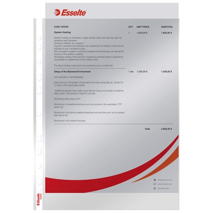 Kvalitetslomme til hverdags brug. Multi-hulningen giver nem opbevaring af dokumenter i brev- og ringordnere- Glasklar 0,08 mm recirkuleret PP folie, copysafe- Åbning i toppen giver nem adgang til papirer uden at åbne mappemekanismen- 11 huller til universal brug- Til A4 format
