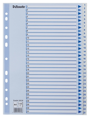 Ekstra bredt A4-register i premium kvalitet, 1-31 numeriske faneblade. 90% genanvendt plast, klimaneutral og 100% genanvendelig. For tydelig organisering af A4-dokumenter, hjælper med at holde styr på vigtige noter eller skolearbejde; til brug i hjemmet, på skolen eller på kontoret. Dette robuste register supplerer perfekt andre produkter fra Leitz Recycle-serien og er lavet til at holde. Moderne og stilfulde grønne kontorartikler, som vil passe ind på kontoret og i hjemmet. Med den nye miljøvenlige Recycle serie fra Leitz kan du både gøre noget godt for dit kontormiljø - og miljøet på vores planet. - Fremstillet af 90% genanvendt plast, 100% genanvendelig og klimaneutral - For klar organisering af A4-dokumenter - 31 faner trykt 1-31 for hurtig dokumentadgang - Dækker ikke faner, når de bruges med lommer takket være ekstra bredt A4 maxi-format - Holdbar 160 g 100% genanvendt kartonoverflade med stor plads til beskrivelse af indhold - 11 huller universal tilpasning for nem arkive