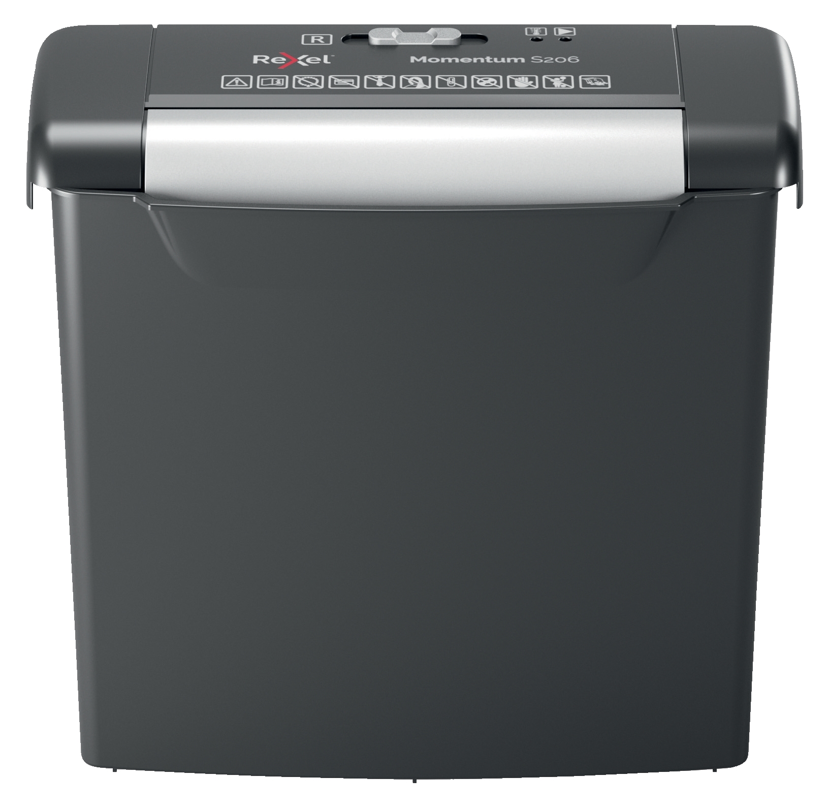 • Kraften til at makulere mere! Rexel Momentum S206 makuleringsmaskine makulerer op til 6 ark på en gang med 2 minutters konstant makuleringstid. Ideel til hjemmebrug. P2, strimmelmakulering i 6 mm stykker. 9 liter beholder med 75 A4 ark kapacitet. - Makulerer op til 6 ark papir på en gang - Standard makulerings-sikkerhedsniveau med P2, strimmelmakulering 6 mm stykker - Makuler flere papirer i en længere periode med 2 minutters konstant drifttid - 9 liter beholder med kapacitet på 75 A4 ark