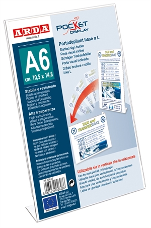 Skilteholder i A6 størrelse med L-fod. Produceret af glasklar polystyren.