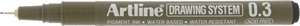 Tegnepen med 0,3 mm metalinkapslet spids. Pennen er vandfast efter den har tørret og blejes ikke. Indeholder vandbaseret blæk uden Xylen.