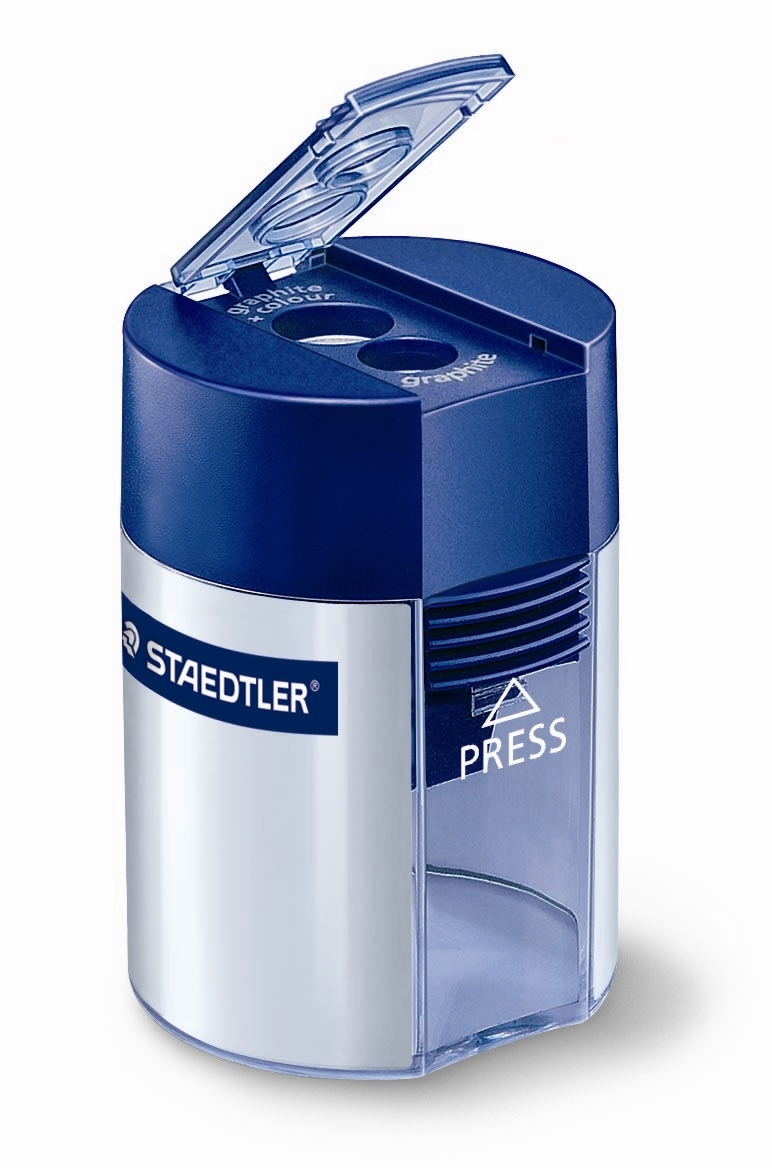 • Dobbelt blyantsspidser med beholder. Den kan spidse tykke og tynde blyanter, farveblyanter mv. Der er metal spidser i, hvilket gør det til en god, solid og holdbar blyantspidser. Det er nemt at tage låget af, så den kan tømmes. Spidser i en vinkel 23° til alm. blyanter og til tykke farveblyanter og blyanter i en vinkel på 30° til brede, bløde linjer.