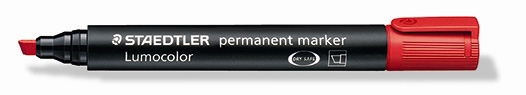 • Permanent marker Lumocolor i høj kvalitet. Skrå spids ca. 2-5mm. Smudsafvisende og vandfast og kan anvendes til mærkning og skrivning på stort set alle overflader så som metal, træ, plast, læder, karton. Tørrer på få sekunder, derfor ideel til venstrehåndede brugere. Farve intensiv. Lysægte. PP skaft og hætte sikrer lang levetid. Indeholder DRY SAFE blæk som gør den kan ligge uden hætte i dagevis uden at tørre ind. Rød. Made in Germany