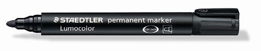 • Permanent marker Lumocolor i høj kvalitet. Rund spids ca. 2mm. Smudsafvisende og vandfast og kan anvendes til mærkning og skrivning på stort set alle overflader så som metal, træ, plast, læder, karton. Tørrer på få sekunder, derfor ideel til venstrehåndede brugere. Farve intensiv. Lysægte. PP skaft og hætte sikrer lang levetid. Indeholder DRY SAFE blæk som gør den kan ligge uden hætte i dagevis uden at tørre ind. Sort. Made in Germany
