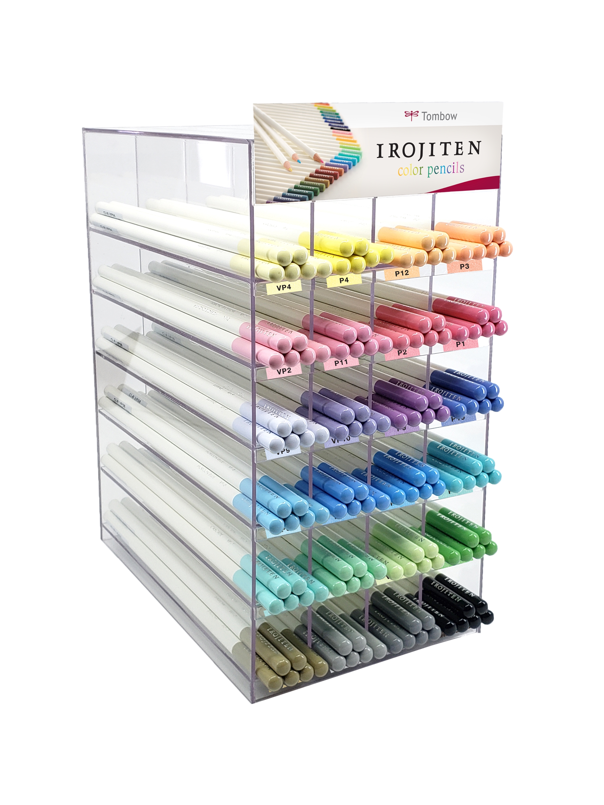 • Irojiten farveblyant indhold til Acrylic display bestående af 144 pastel penne. 6 stk. x 24 farver (CI-RVP4, -RP4, -RP12, -RP3, RVP2, -RP11,-RP2, -RP1, -RP9, -RVP10, -RVP9, -RP19, -RVP8, -RP8, -RP18, -RP17, -RVP7, -RVP6, -RVP5, -RLG3, -REX10, -RP10 og -RV10) = 144 penne. Display bestilles på særskilt varenr. (TOM29255). Irojiten er en elegant farveblyant til kunstnere og hobbyfolk. En pen i et stilfuld design med en cremet hvid lak på ydersiden, som afsluttes med pennens farve. 100 forskellige nuancer, herunder pastel- og neonfarver. Den faste voksbaserede kerne er ideel til at skabe præcise linjer og detaljer. "IROJITEN" er japansk og betyder "farve -encyklopædi". Farverne smitter ikke af og vandtætte. IROJITEN kan let blandes og påføres oven på hinanden. Moderat lysægthed.