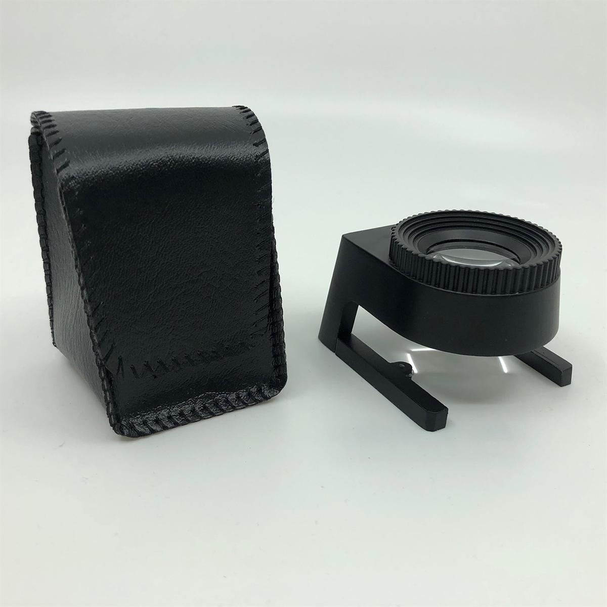 Der med en lille vinylpose til beskyttelse af luppen under opbevaring.